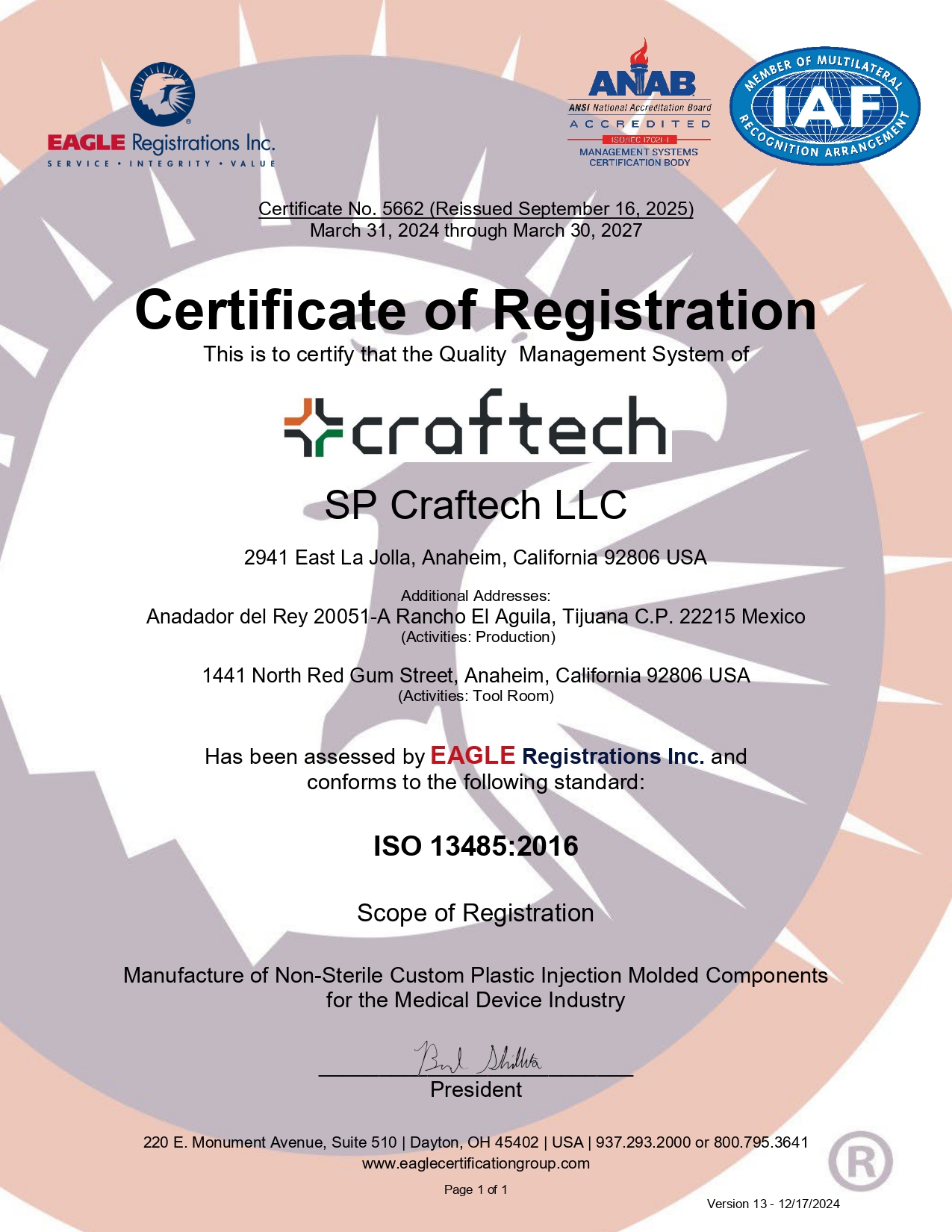 Our ISO 9001:2015 and ISO 13485:2016 certifications are maintained across both our Anaheim, CA and Tijuana, Mexico facilities, ensuring consistent quality and environmental standards at every location.